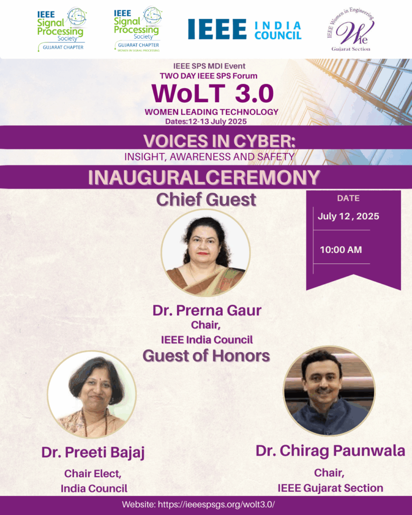 The Women Leading Technology 3.0 (WoLT 3.0) is an international online IEEE SPS forum with a theme “VOICES IN CYBER: INSIGHT, AWARENESS AND SAFETY”, Organized by Women in Signal Processing (WiSP), IEEE SPS Gujarat Section, in collaboration with the IEEE India Council and WIE, IEEE Gujarat Section. Event is scheduled online during 12–13 July 2025 from 10:00 AM to 5:00 PM IST. This third edition aims to amplify the voices of women in the domain of cyber security. Through WoLT 3.0, WiSP endeavors to foster meaningful discussions, enhance awareness, and promote safety in the digital world. The two-day online event welcomes students, professionals, academicians, and tech enthusiasts to engage with visionary women entrepreneurs, researchers, and leaders, encouraging collaboration and inspiring future pathways in cyber technology.. The Day-1 includes expert talks and technical workshop by experts in the field of cyber security. Day 2 includes expert talk and panel discussion by renowned experts.